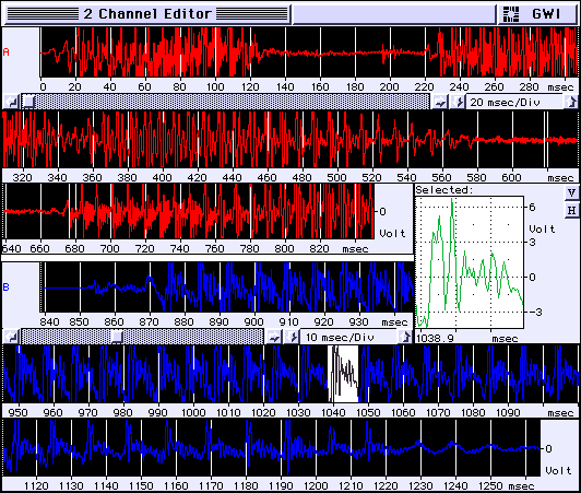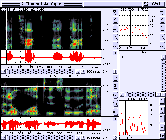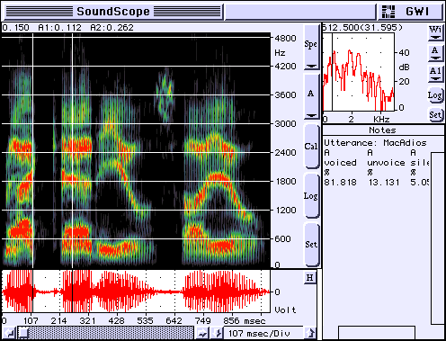 This instrument features dual time waveform windows for viewing and comparing two sound waveforms simultaneously, dual analysis windows which can be used to display and compare spectrograms, Fo and other pertubation measurements of the two sound waveforms, dual snapshot windows for displaying and comparing FFT''s, LPC, and expanded time segments of the two sound waveforms, and a journal for keeping notes.