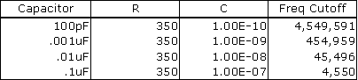 12), a low pass filter consisting of two capacitors, labeled "C" in the previous diagram, is often used to attenuate RFI that is not stopped with the previously mentioned Wiring Guidelines. One capacitor is positioned between the GND and Vin- instruNet screw terminals, and the other is positioned between the Vin+ and Vin- screw terminals, at the instruNet box. The capacitors are strongly recommended with the i100, since even a small loop of wire in the measurement path will pick up some RFI. The cutoff frequency of the low pass filter is a function of the capacitor value, as shown in the following table. If you are not interested in signals greater than 1KHz, then 0.1uF is recommended; otherwise, you'll need a smaller capacitor and a larger cutoff frequency.