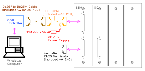 i410 The i410 connects Card Cage to Windows Computer via i2x0 instruNet Controller.
