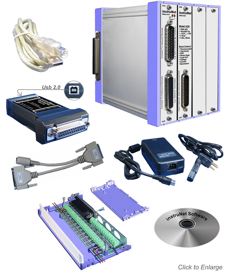 instruNet is a low-cost hardware card cage that attaches to Windows computers via high speed USB. The advantage of an i4xx card cage is one can mix and match modules as needed, to build exactly what they need. The advantage of the instruNet card cage is cost. For example, instruNet 4 to 16 slot chassis sell for $100 per slot, whereas comparable chassis are 2x to 4x more costly.