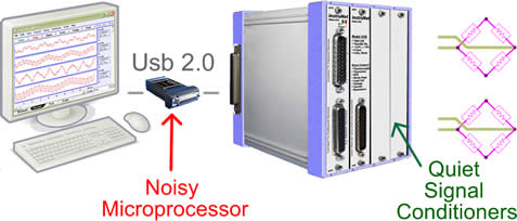 The i4xx card cage obtains high accuracy by placing the noisy microprocessor in an external box, away from the signal conditioning amplifiers in the card cage; as illustrated below.