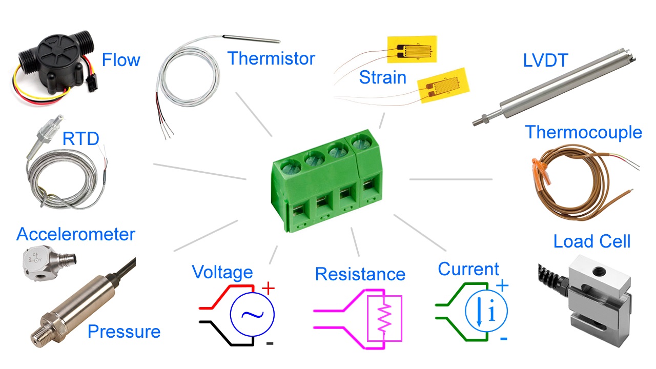 instruNet measurement modules have universal inputs that enable one to directly connect each channel to one of: Thermocouple, Thermistor, Strain Gage, Load Cell, Counter/Timer, RTD, Voltage, Current, Resistance and Accelerometer. Absolute accuracy for all of these sensor types is specified. In some cases, the end user adds an external shunt resistor. The advantage of universal inputs is cost.