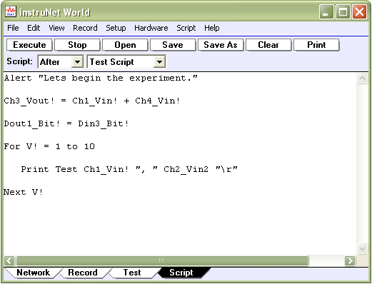 Scripts are developed in the Script page, shown below, which is enabled by pressing the Script tab at the bottom of the instruNet World window.