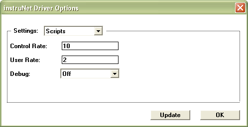The Script Options dialog box, shown below, enables one to view and adjust the Control Rate, the User Rate, and the Debug On/Off status. To open this dialog, select Script Options in the Script menu.