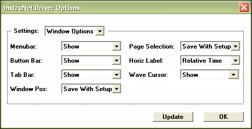 To open this dialog, select Window Options in the Setup menu. The menu bar at the top of the window and the tab bars at the bottom of the window are sometimes hidden to reduce the number of options available to the instrument operator. Alternatively, one can hide the Tab Bar at the bottom and the Button Bar at the top to create more space, and rely entirely on the Menu Bar. To show the menu bar after hiding it, one can press keys CONTROL SHIFT 'M'. If one saves the Page Selection with the .prf file, then the page that is selected (e.g. Record) when one saves the .prf file is automatically loaded when one opens that file. If one saves the Window Position with the .prf file, then the Window position and size is restored when one loads the .prf file.