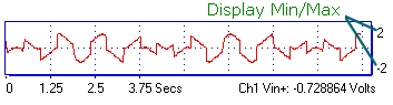 It is in the Options dialog that one specifies to Plot Dots or Lines, to turn the Grid On or Off, to set the horizontal scale (i.e. time per horizontal division), and to set the maximum plotting density (maximum points plotted per horizontal pixel). Plotting Lines (i.e. connecting points with lines) takes more time than Dots, yet is easier to read if the points are far apart. The Grid take some time to plot as well, and might not be desirable if you are trying to maximize your update rate in Oscilloscope mode. If the horizontal scale (Horiz Scale) is too small (e.g. 10ms/div), the waveform might whip across the screen and be difficult to see in the Strip Chart mode. The maximum points per horizontal pixel parameter is useful at plotting only a fraction of the digitized points in cases where you are digitizing ten's of thousands of points and don't want the computer to slow down due to plotting. The Horizontal Position field is very similar to the Horizontal scroll bar in that it defines the time of the left edge of all displays. If Overflow Alert is set to On, an Alert box is shown when a digitize buffer overflows (i.e. it fills faster than it is read); otherwise digitizing proceeds without an Alert.
