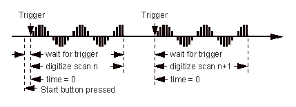 A typical example of how a data acquisition program using Oscilloscope mode would work is as follows: first the program would wait for the user specified trigger condition and then acquire the first scan of data; next the program would process the acquired scan (i.e. display, analyze, save to disk) while instruNet continued to acquire scans in the background based on the trigger condition, while the processing is going on; next the program would retrieve the most recent scan from the queue, ignoring older scans.