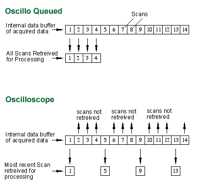 Oscilloscope mode has two variations, Oscilloscope and Oscillo Queued. Both Oscilloscope and Oscillo Queued acquire and store scans of data in a buffer for processing. In Oscilloscope mode the most recent scan of data in the buffer will always be returned for processing (first in, last out). In Oscillo Queued mode the scans are retrieved from the buffer in sequence (first in, first out).