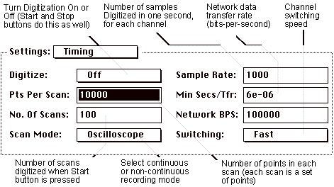 Fields specify the number of points (4bytes per point) that are digitized for each Scan, and the number of scans that are digitized when the Start button is pressed. For example, if you digitize 100 pts/second, with 1000 points per Scan (i.e. 10sec per scan), and 10 scans, then your entire acquisition would consume 100seconds. Pressing the Stop button will halt the digitization process, independent of where it is in its cycle. The Scan Mode field was discussed in