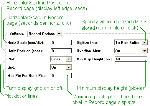 The Record Page is used to view record digitized waveforms in real-time, store these waves to disk,