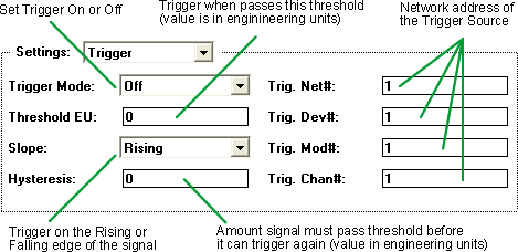 Trigger Options The Trigger dialog is accessed by pressing the Trigger button within the Setup dialog. This dialog is used to specify when digitizing begins after the Start button is pressed, as illustrated below.