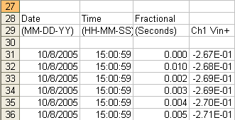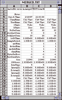 Press the Save button in the Record page (or, if running instrunet World+, one can select Save Waveforms To Excel in the Record menu) to save the data to disk in a text file named "Excel Waveform Data.txt". This file places each channel in its own column, and looks something like the above illustration when opened with a spreadsheet program. Columns are separated with TAB characters, and rows are separated with CARRIAGE RETURN characters.