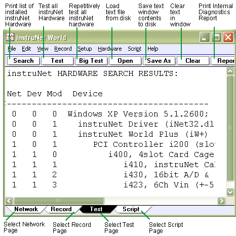 The Test Page, illustrated below, is used to determine what instruNet hardware is attached to your computer, and to test all instruNet hardware and software. After each test, a report is printed to a miniature text editor within the Test Page. The user can then type notes into this window and save them to disk as a text file, to later be opened with the Open button in the Test Page, or a word processor. The Test Page supports the standard text Cut, Copy, and Paste commands, in addition to typing (i.e. Control X, C, and V in Windows). To select the Test Page, press the Test tab at the base of the instruNet World window.