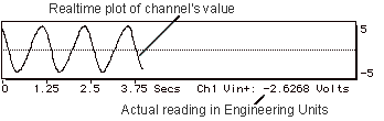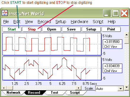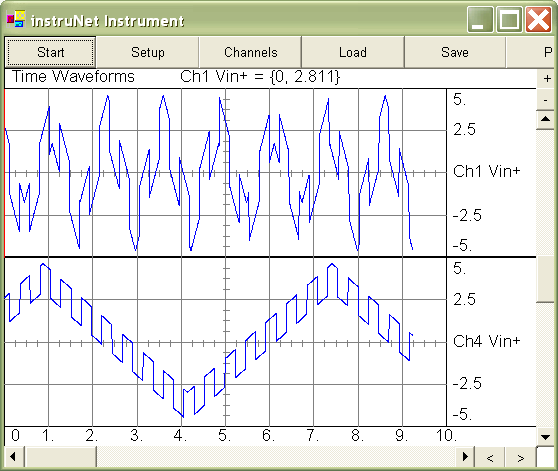7. Tell instruNet to start digitizing. Click the Start button at the top of the window to tell instruNet to record and display channels that have been enabled for digitizing (e.g. "Ch1 Vin+"). You should see your waveforms move across the screen as they are digitized in real-time, as illustrated below.