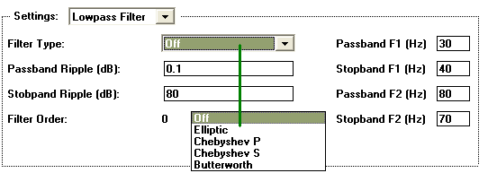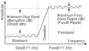• Play with the different filter models and settings while viewing their effects in the snapshot display. For example, to turn on a highpass filter, select Highpass Filter in the Settings popup, select Elliptic in the Filter popup, and then set the Passband F1 Hz, Stopband F1 Hz, Stopband Attn, and Passband Ripple fields as desired using Figure 2.19 as a guide. Remember to press the Enter or Update button to create the filter.