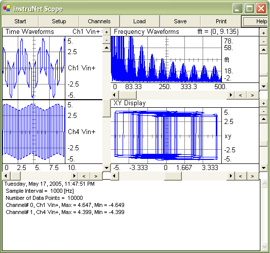 • Press the Start button and watch the data appear in the window, as shown below. Ch1 and Ch2 timewaves are shown in the left-most display, the frequency spectrum of Ch1 is shown in the upper-right display, and an XY plot of Ch1 and Ch4 are shown in the lower-right display.,