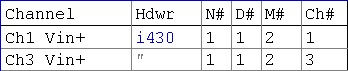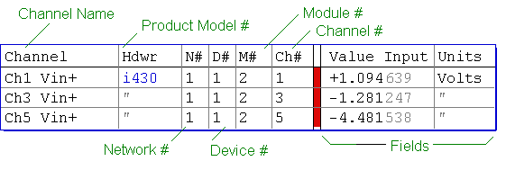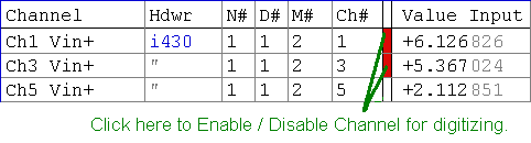 4. Enable a Channel for digitizing. A channel is enabled for digitizing by clicking on the small cell between the address (N/D/M/Ch) and ValueInput columns within the Network page, as illustrated below. Once enabled, the channel will be digitized when the user presses the Start button on the Record page. To disable a channel, one must click the digitize on/off cell again. This digitize on/off cell is black or red when On, and white when Off. Any number of channels can be selected for digitizing.