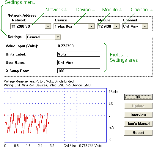 Please enable several voltage input channels for digitizing. An example of this is illustrated below where "Ch1 Vin" and "Ch3 Vin" are enabled for digitizing on the i430. Voltage input channels are typically labeled ChX Vin+ or ChX Vin-. These work identically when doing single-ended voltage measurement (i.e. read a voltage between an input terminal and ground), and are used as a pair when doing differential voltage measurement (i.e. reading a voltage between 2 input pins). If instruNet voltage input hardware is not installed, you will not be able to digitize. Also, note that the contents of the Network page may vary depending on what is installed on your computer.