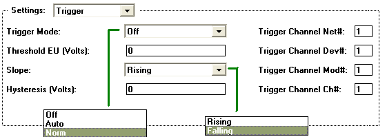 Trigger Modes instruNet World allows triggering from any channel on either a low-to-high or high-to-low transition through a threshold value. The threshold is specified in the Thresh EU field, and the trigger direction is specified in the Slope field (i.e. low-to-high, or high-to-low). The channel to trigger from is specified by its network address in the Trig Net#, Trig Dev#, Trig Mod# and Trig Chan# fields.