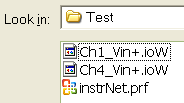 Load your saved waves from disk Click the Open button to load in the previously saved waves from disk. A File open dialog will appear, and it is here that you must select one of your previously saved files (e.g. "instruNet.prf", "Ch1 Vin+" or "Ch3 Vin+"). After your waves are loaded in, they should appear in their displays.