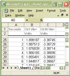 Press the Start button and watch a new spreadsheet window appear and fill with instruNet data, as shown to the right. When finished, you can save or delete the Excel spreadsheet file.