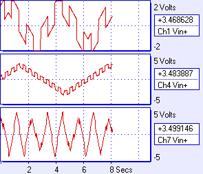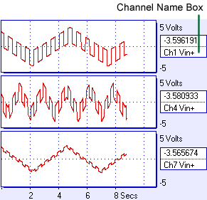The waveforms should appear on the screen, with the beginning of each Scan synchronized to the trigger event. If the signal applied to the trigger channel does not periodically cross the threshold voltage, Auto trigger will digitize anyway every second or so.