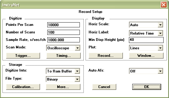 • Select Oscilloscope in the Scan Mode popup and set the Points per Scan field to 100. 100 points at 1000s/sec will take 0.1 seconds to acquire. Leave the rest of the Dialog in its default settings, and click OK to return to the Record Page.