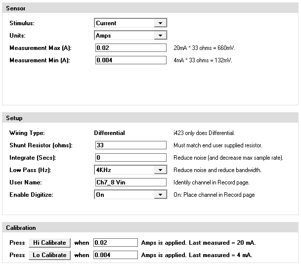 Enter the expected minimum and maximum expected current (e.g. 0.004 to 0.020 Amps).