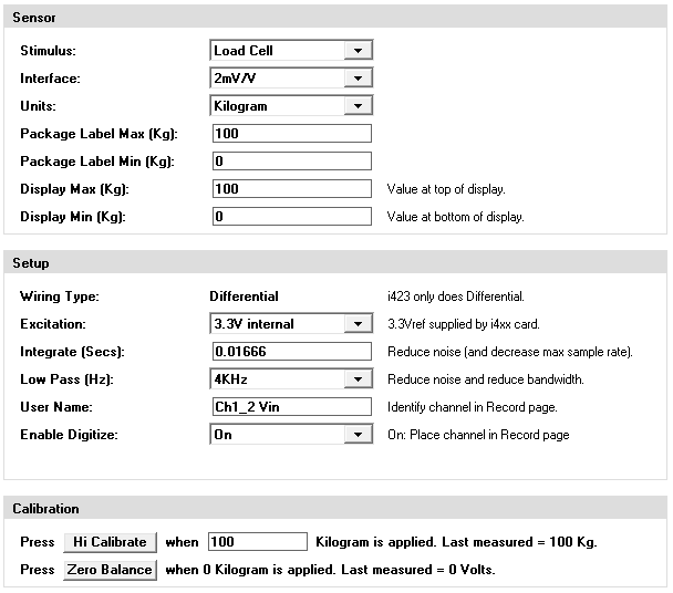 Sensor Package Label minimum of 0Kg and Sensor Package Label maximum of 100Kg.